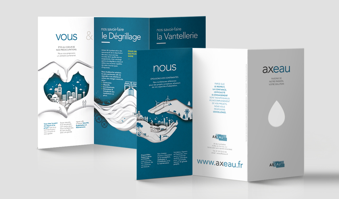 Identité visuelle de la société Axeau, spécialisée dans le traitement des eaux - travaux de Vantellerie et Dégrillage. Création des "illustrations papier" puis création complète de la plaquette de communication - 3 volets - découpe en forme de goutte d'eau sur la 1ere de couverture.