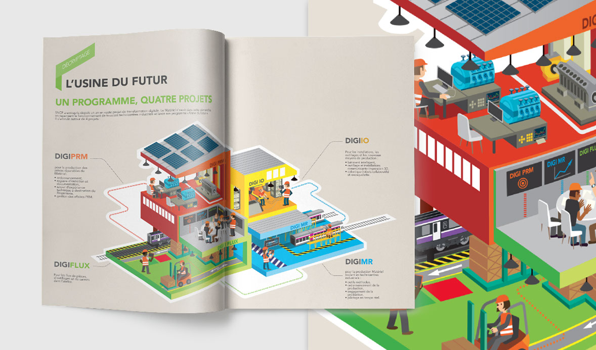 Conception création de l'infographie " l'usine du futur ", un technicentre de maintenance SNCF.